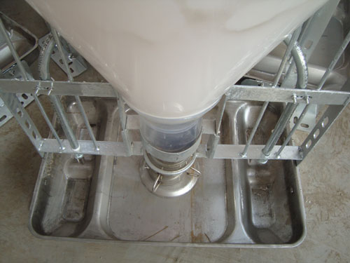 猪用干湿料槽是一种集合自动料槽和饮水功能为一体的新养殖设备,也上新专利技术产品,粉料和颗粒都能下料,通过设计巧妙的阀门模式均匀出料,以及自动调节功能,另外附加饮水设备,让猪只不必在食料和饮水来回跑动,利用饲料的消化吸收。通过实验证明,用干湿料槽做为饲喂工具的对照组和用水泥料槽做为饲喂工具的对照组,干湿料槽的有组生长速度明显增加。
